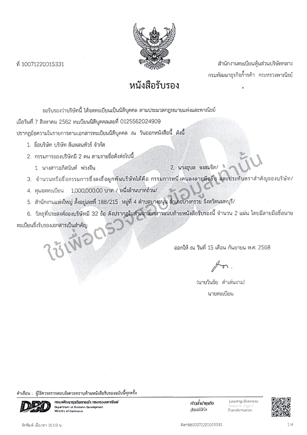 บริษัทดีแพลนทัวร์จำกัด เริ่มขึ้นตั้งแต่วันที่ 9 กันยายน 2562 เราได้จดทะเบียนการค้าพาณิชย์และขึ้นทะเบียนบริษัทพร้อมทั้งวางหลักประกันที่กรมการท่องเที่ยวอย่างถูกต้องตามกฎหมาย ตามพระราชบัญญัติธุรกิจนำเที่ยวและมัคคุเทศก์ประเทศไทย ใบอนุญาตเลขที่ 11/13285